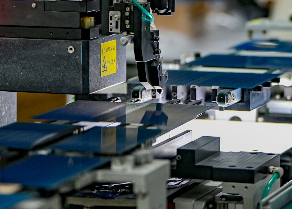 9月22日,在新疆巴音郭楞蒙古自治州若羌县的国晟企诚新能源有限公司,全自动划片机在切割光伏电池片。