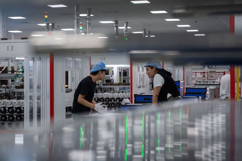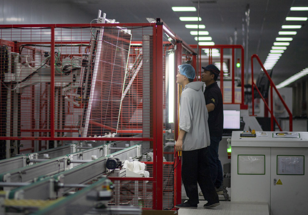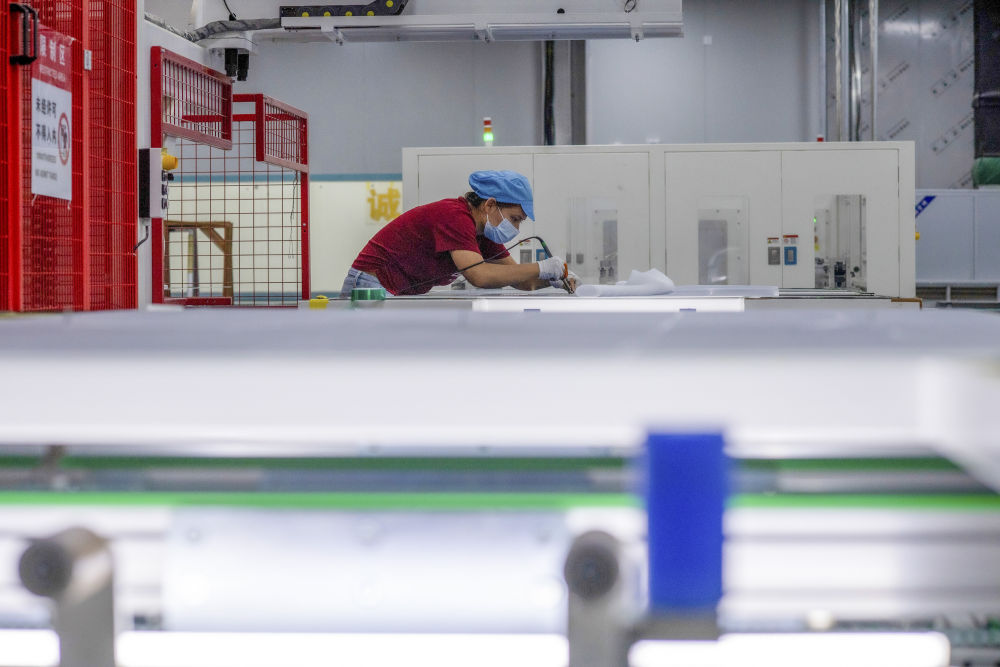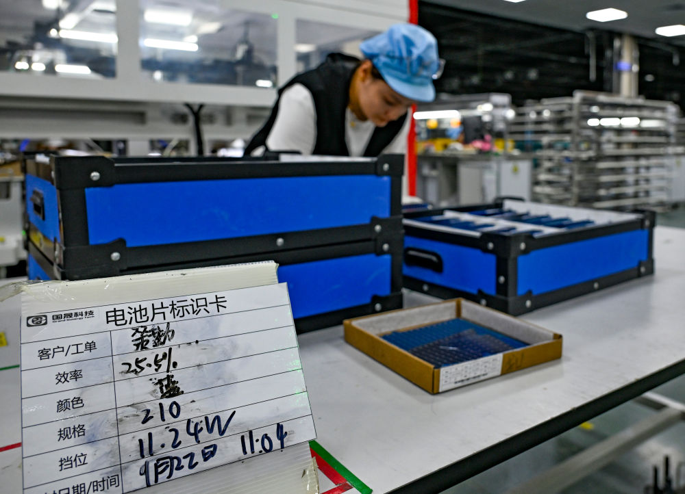 9月22日,工人在新疆巴音郭楞蒙古自治州若羌县的国晟企诚新能源有限公司生产光伏电池片。