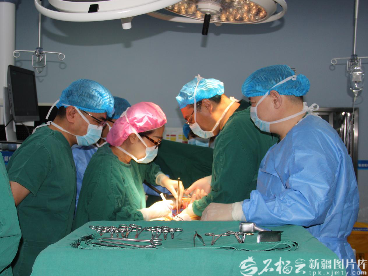 新疆医科大学第一附属医院党委委员、副院长吐尔干艾力·阿吉(右二)与消化血管外科中心主任邵英梅(左二),在阿勒泰地区人民医院开展手术示范教学。陈锋摄