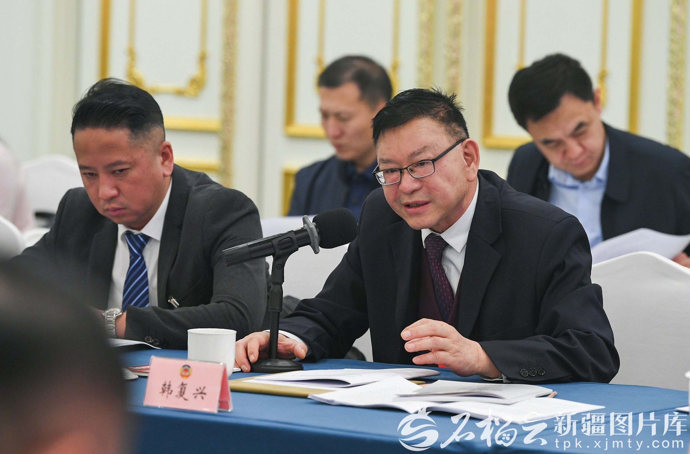 1月27日,经济界、工商联界委员分组讨论政府工作报告、自治区“十五五”规划纲要草案、计划草案报告和预算草案报告时,工商联界韩复兴委员(前排右一)围绕提升社会民生保障服务水平等内容发言。石榴云/新疆日报记者 约提克尔·尼加提摄