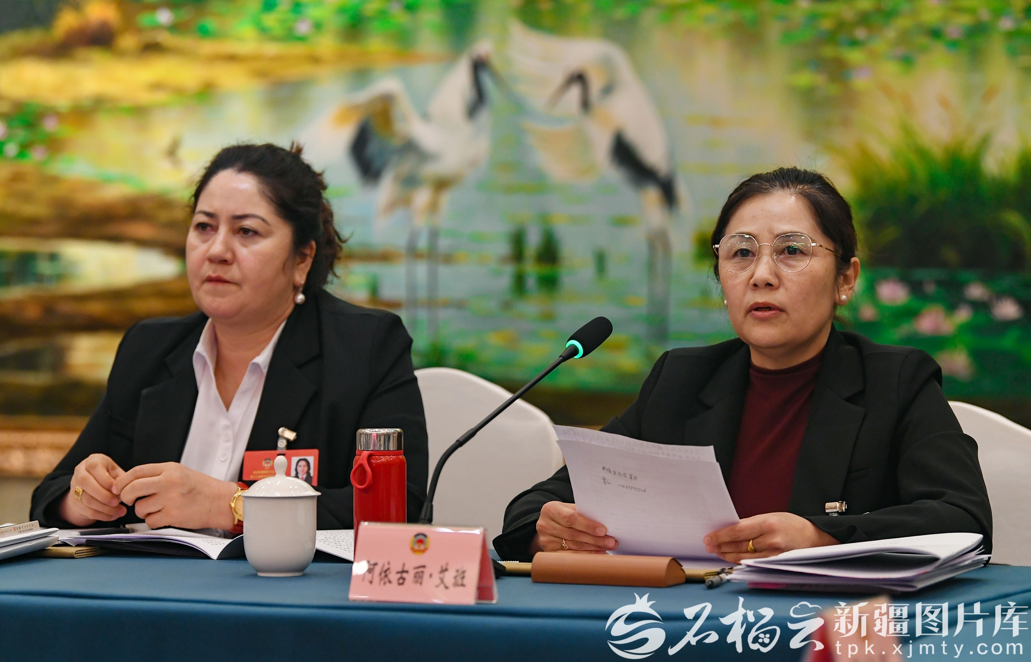 1月27日,农业界、环境资源界委员分组讨论政府工作报告、自治区“十五五”规划纲要草案、计划草案报告和预算草案报告时,农业界阿依古丽·艾班委员(右)围绕加大美丽乡村建设等内容发言。石榴云/新疆日报记者 约提克尔·尼加提摄