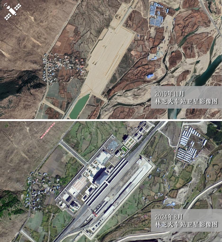 解读:2019年11月施工初期(上图)对比建成后的2024年8月(下图),林芝火车站站房及轨道系统落成。