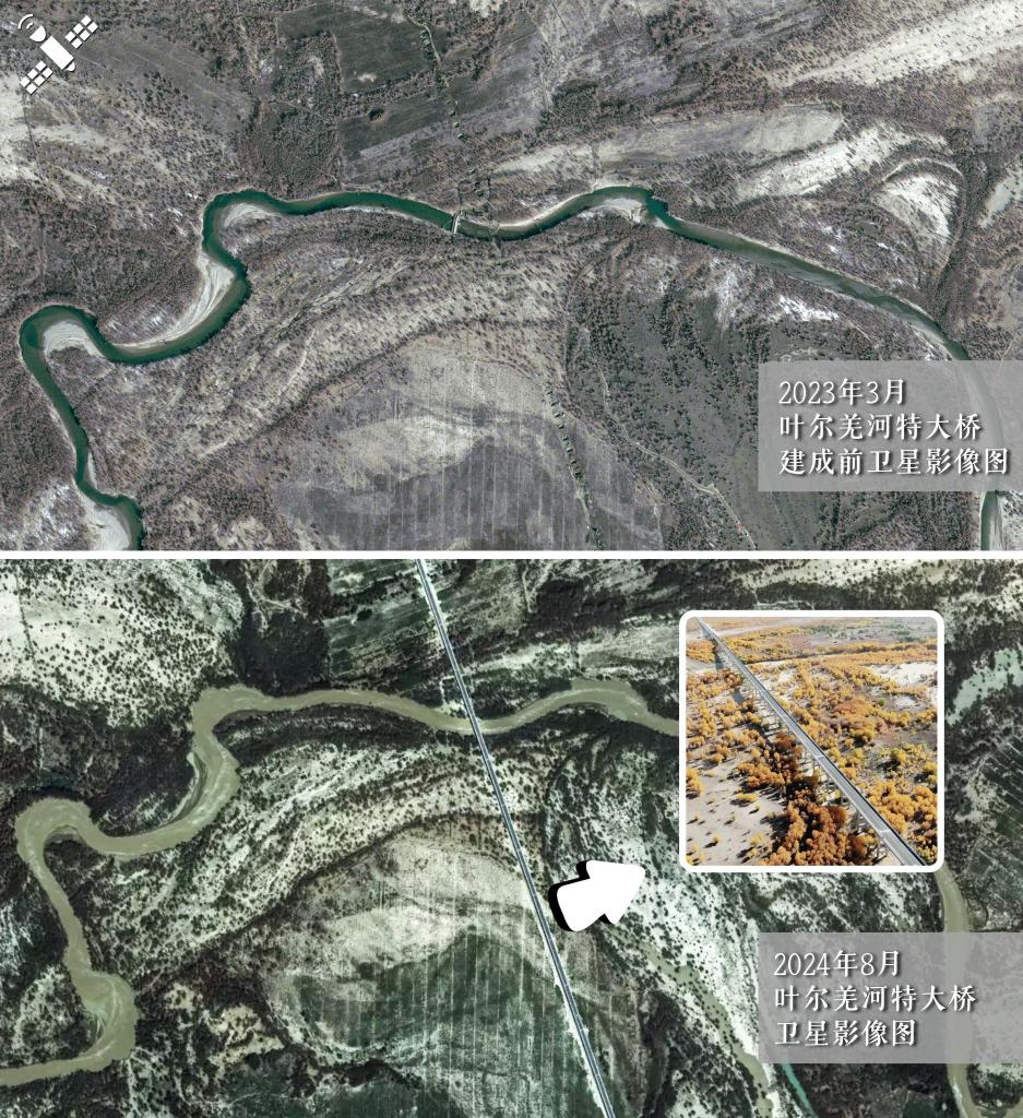 解读:2023年3月桥墩施工(上图)对比建成后的2024年8月(下图),特大桥桥体穿越胡杨林自然保护区。