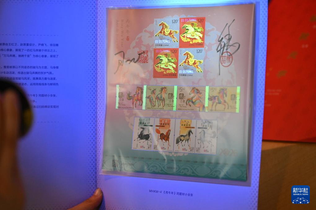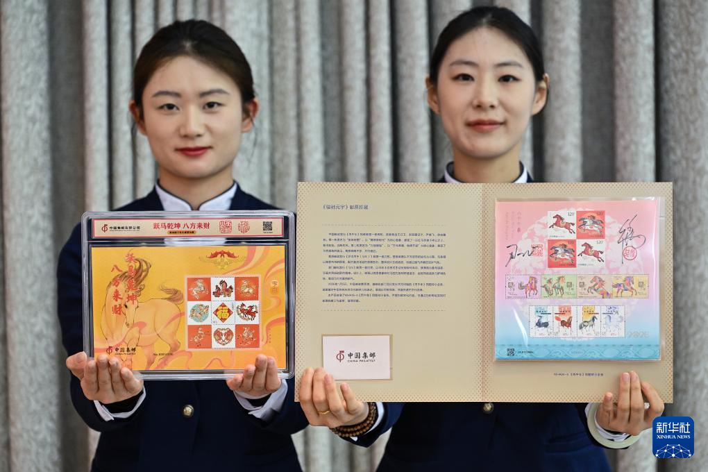 1月29日,工作人员展示活动现场发布的《跃马乾坤 八方来财》雕刻版生肖主题邮票珍藏摆件(左)和《骏驰元宇》邮票珍藏册。新华社记者 李鑫 摄