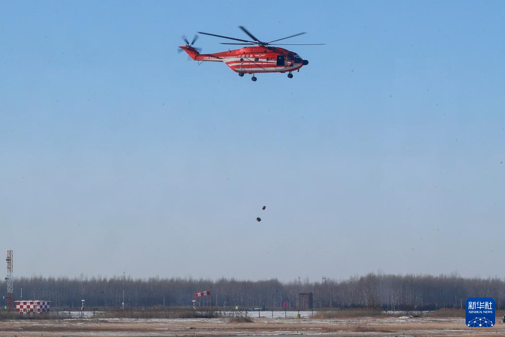 1月29日,在空投实战化训练现场,救援直升机完成精准空投。新华社发(闫安童摄)
