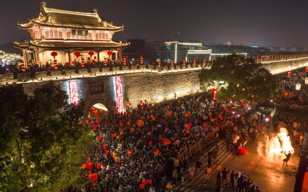 2026年2月14日,市民游客在湖北襄阳古城观看 “千灯临汉 万户迎春”迎新春演出(无人机照片)。
