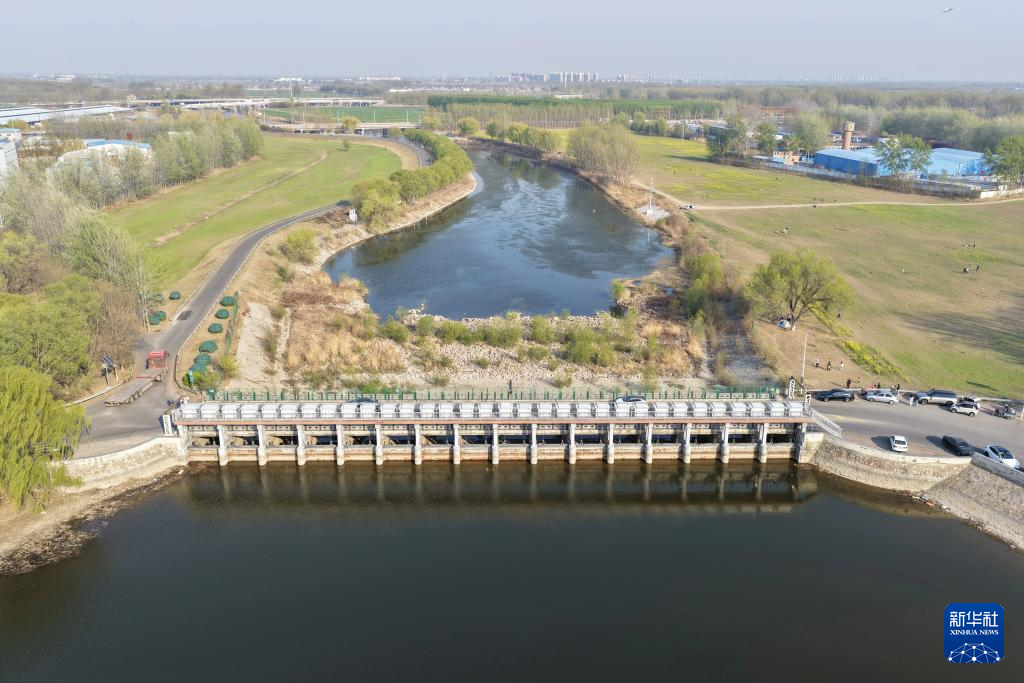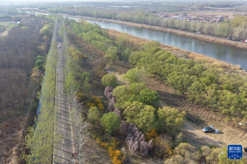 4月4日拍摄的京杭大运河天津武清段的春天景色(无人机照片)。新华社记者 邢广利 摄