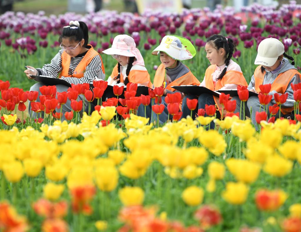 4月1日,在安徽巢湖经济开发区半汤郁金香高地,小朋友参加春假写生活动。新华社发(马丰成摄)