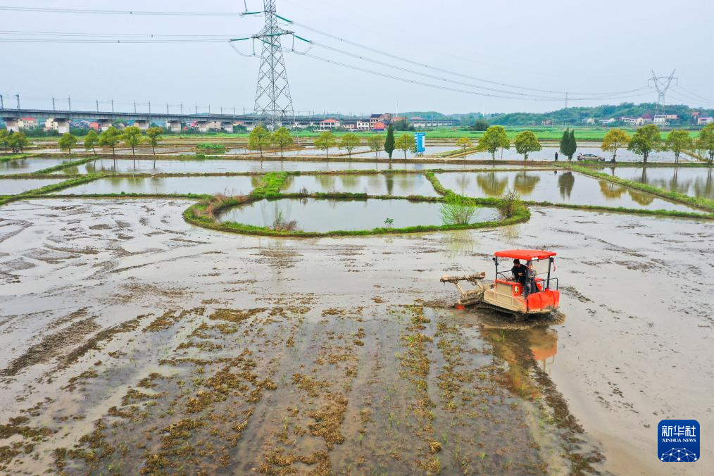 4月9日,湖南省衡阳市衡阳县台源镇台九村农民驾驶农机在翻耕农田(无人机照片)。新华社发(刘欣荣摄)