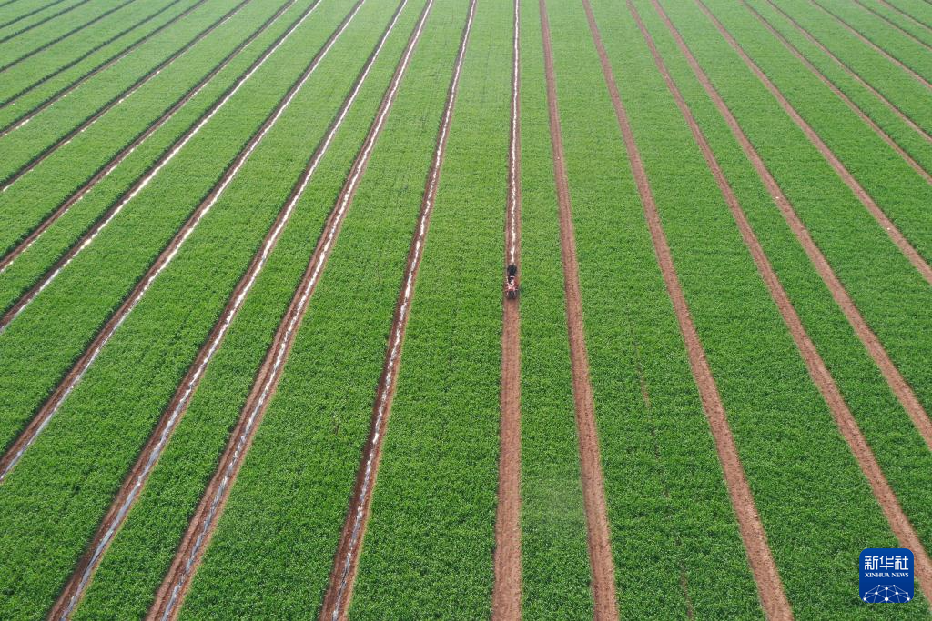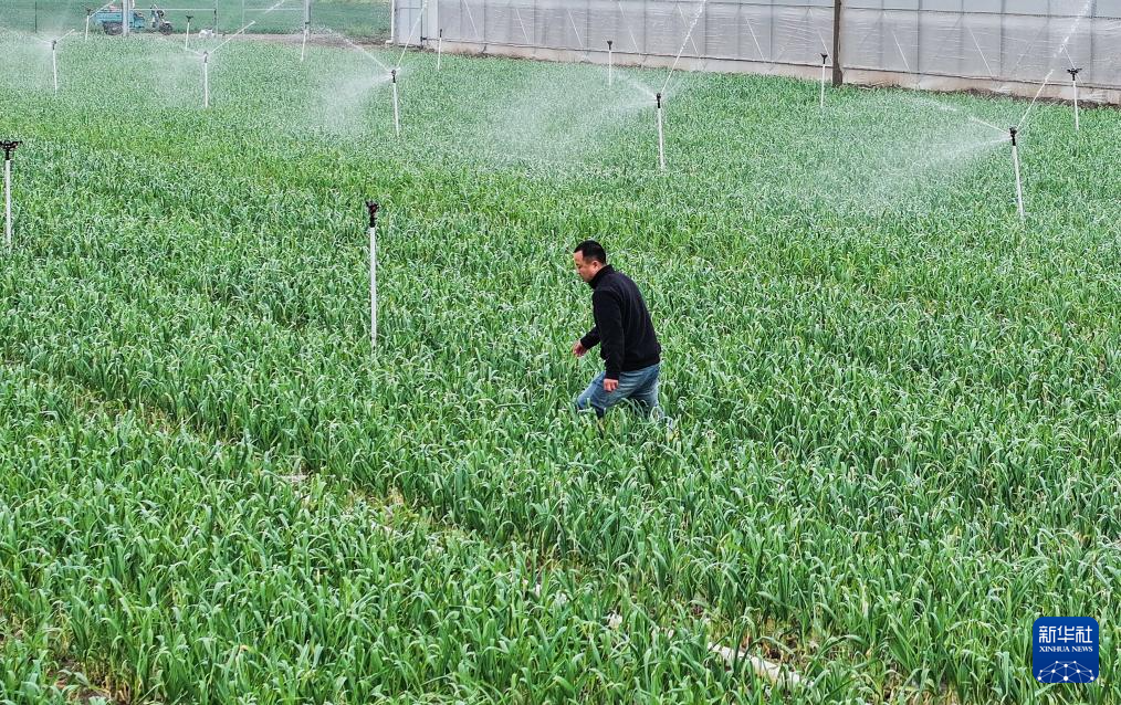 4月9日,在山东省邹平市黛溪街道,农民给大蒜浇水(无人机照片)。新华社发(董乃德摄)