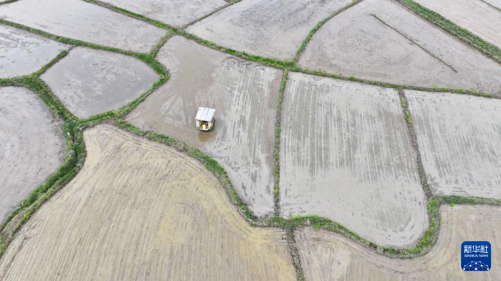 4月8日,在湖南省永州市道县梅花镇车头村,村民驾驶插秧机插早稻(无人机照片)。新华社发(何红福摄)