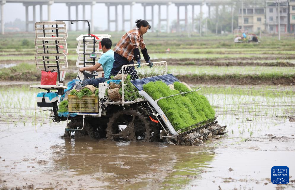 4月8日,在湖南省永州市道县梅花镇车头村,村民驾驶插秧机插早稻。新华社发(何红福摄)