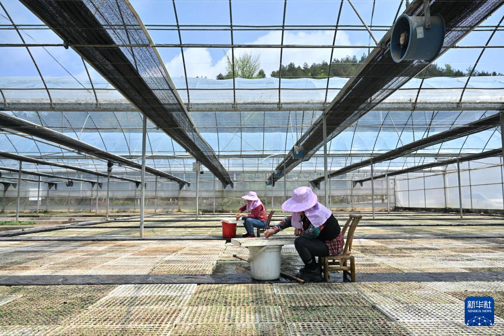 4月9日,在湖北省宣恩县椒园镇锣圈岩社区的水上漂浮育苗大棚里,农民进行间苗作业。新华社发(宋文摄)