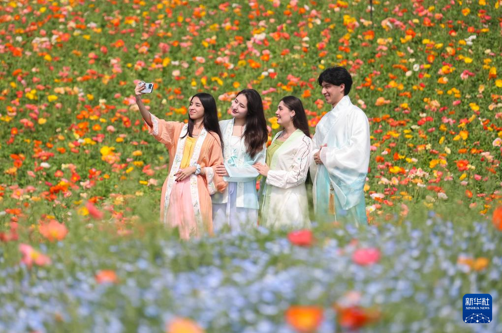 4月10日,在江苏省句容市白兔镇伏热花海,江苏农林职业技术学院的外国留学生在赏花拍照。新华社发(钟学满摄)