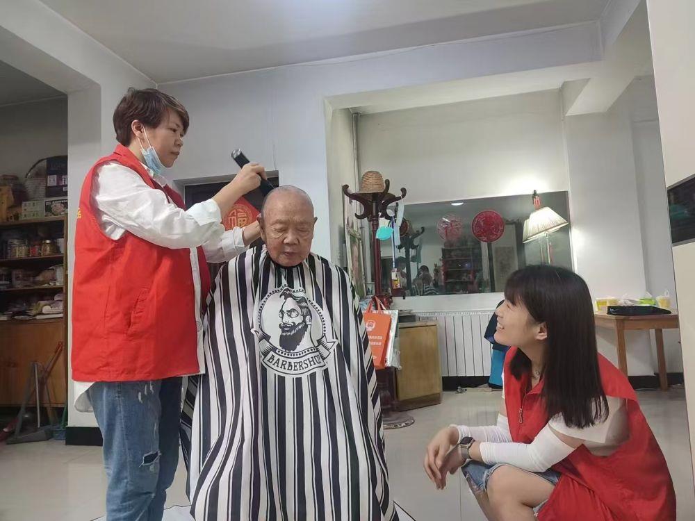 △陕西西安碑林区黄雁社区的工作人员和志愿者上门为留守老人提供剪发服务。
