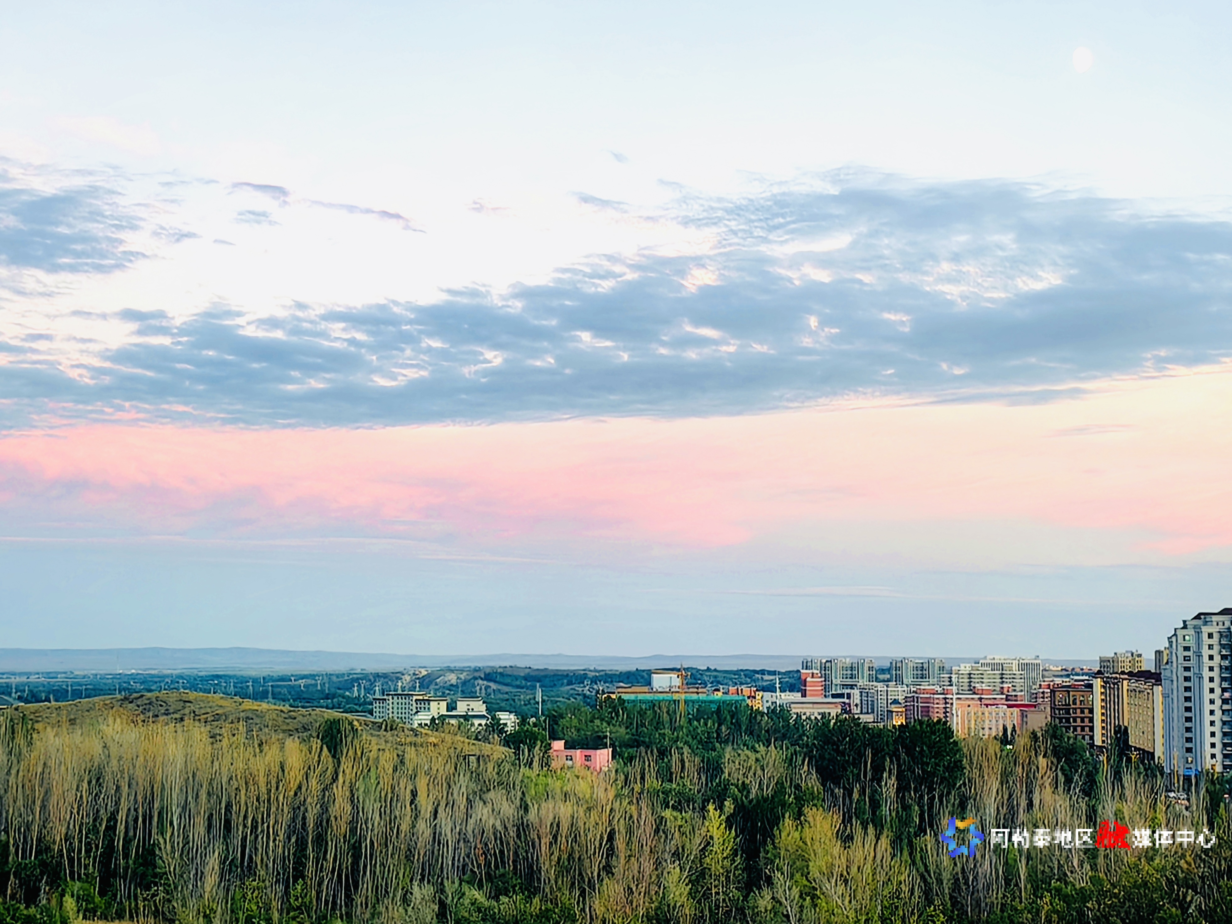 阿勒泰新闻网-阿勒泰地区融媒体中心(记者 杨玮璇)阿勒泰的傍晚,粉紫晚霞晕染天际,城市建筑、城郊草木都浸在柔和光晕里。浅蓝与粉紫交融的天空,像大自然打翻了颜料盘,把小城扮成浪漫画框,晚风轻拂,满是治愈的诗意。