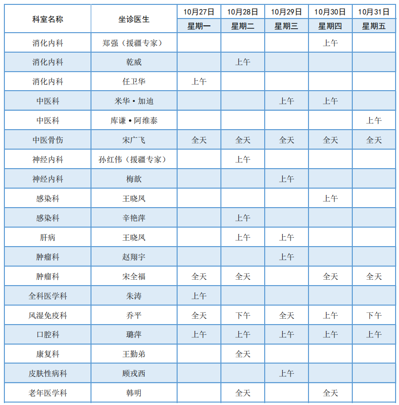 阿勒泰地区人民医院10月27日至31日专家门诊坐诊表