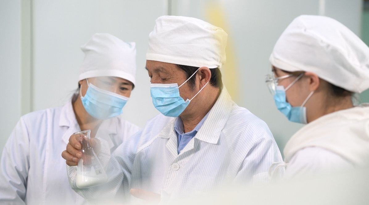 新疆旺源集团公司董事长陈钢粮正和技术人员开展研发。资料图