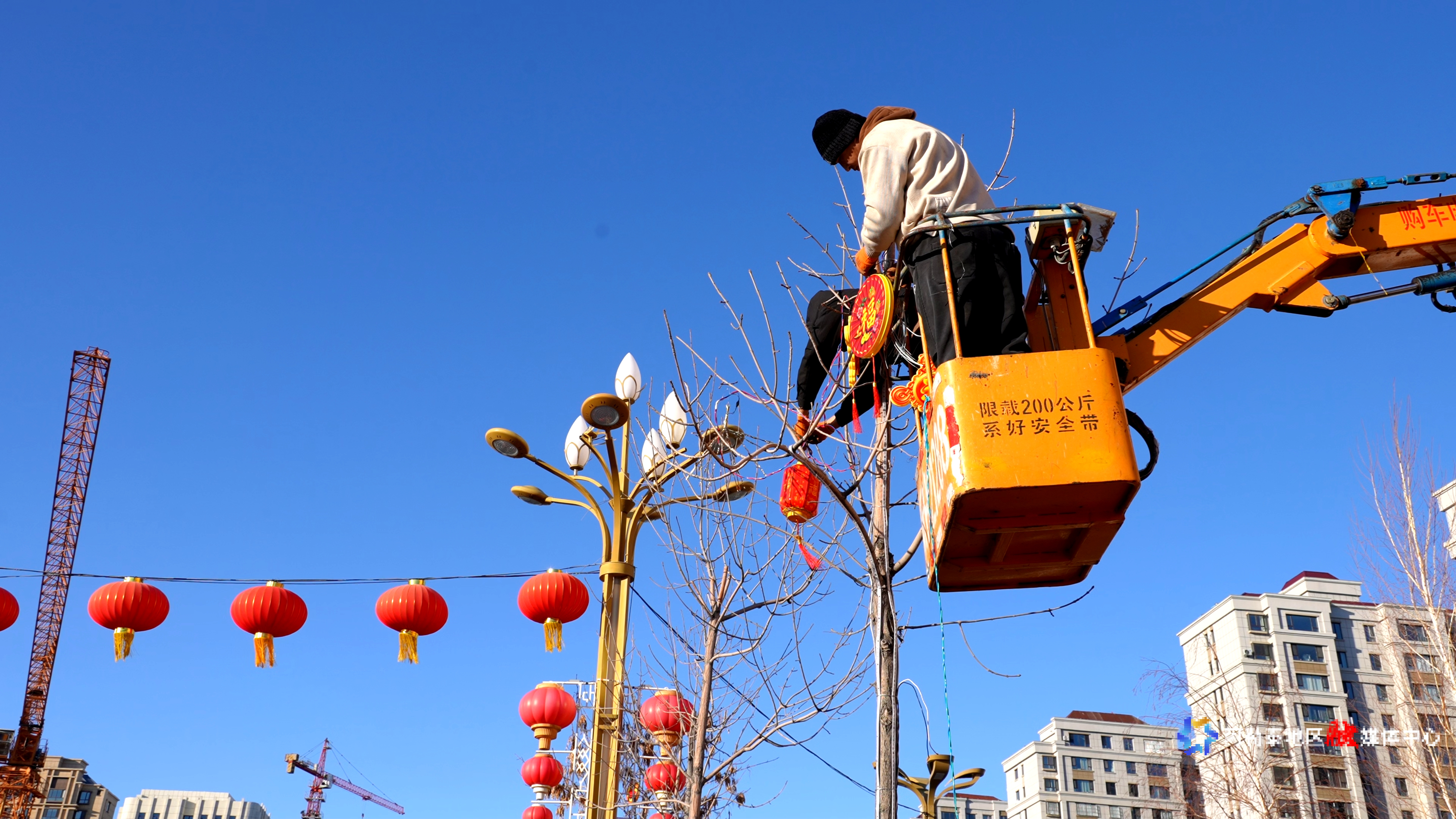 阿勒泰市住建部门组织工作人员在城区主次干道、商圈广场及过街通道,有序开展春节亮化工作。实习记者 马海娜·马格尔摄