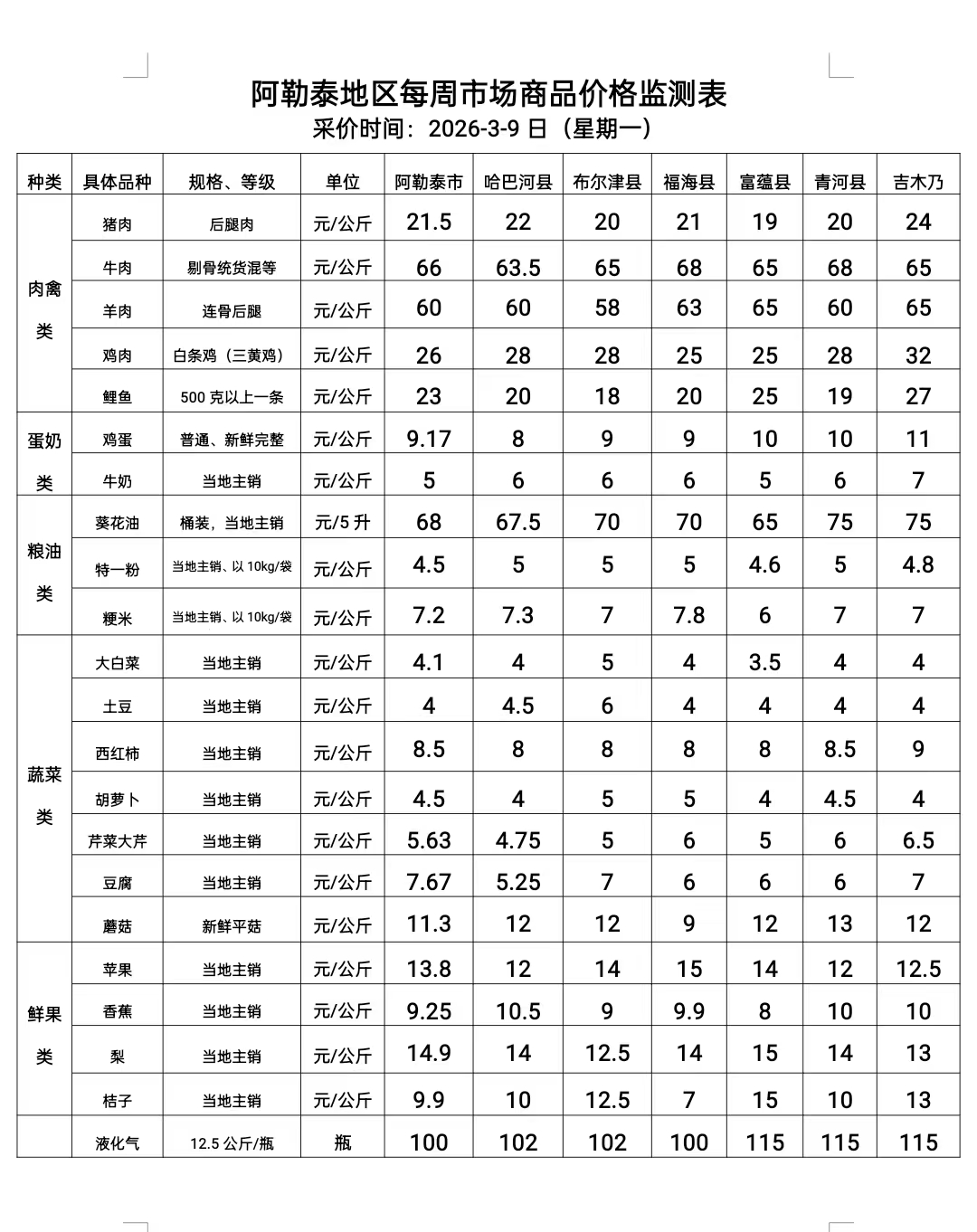 阿勒泰地区每周市场商品价格监测表