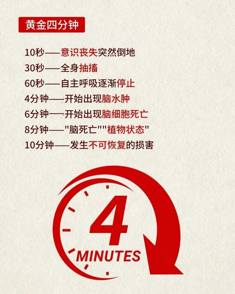 心脏骤停发生后,4—6分钟是急救黄金时间,这是挽救生命的关键窗口期。医学研究表明,大部分心脏骤停患者会在4—6分钟内出现不可逆脑损伤,随后逐步走向生物学死亡,每延迟1分钟抢救,患者生存率就会下降约10%。心脏骤停发作10秒内,患者会出现黑朦、晕厥、瞳孔散大等症状,此时迅速、正确实施心肺复苏,是留住患者生机的核心举措。