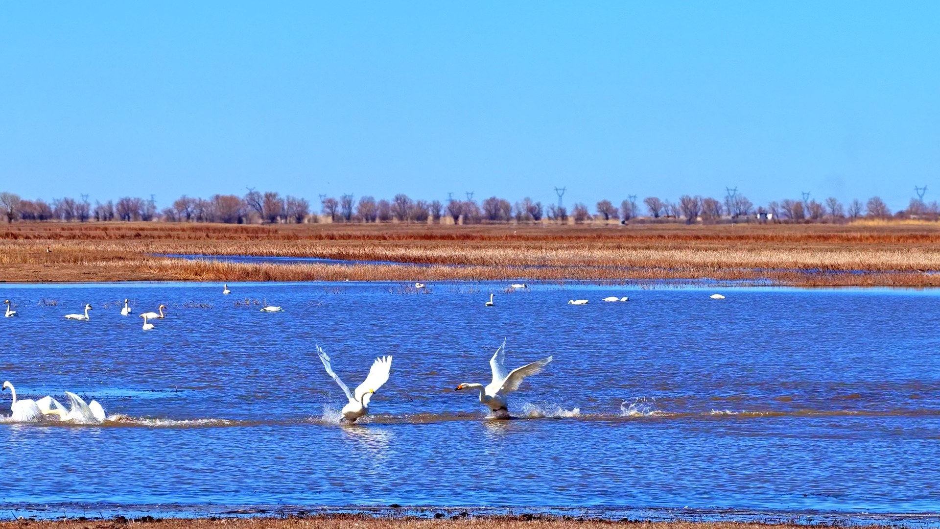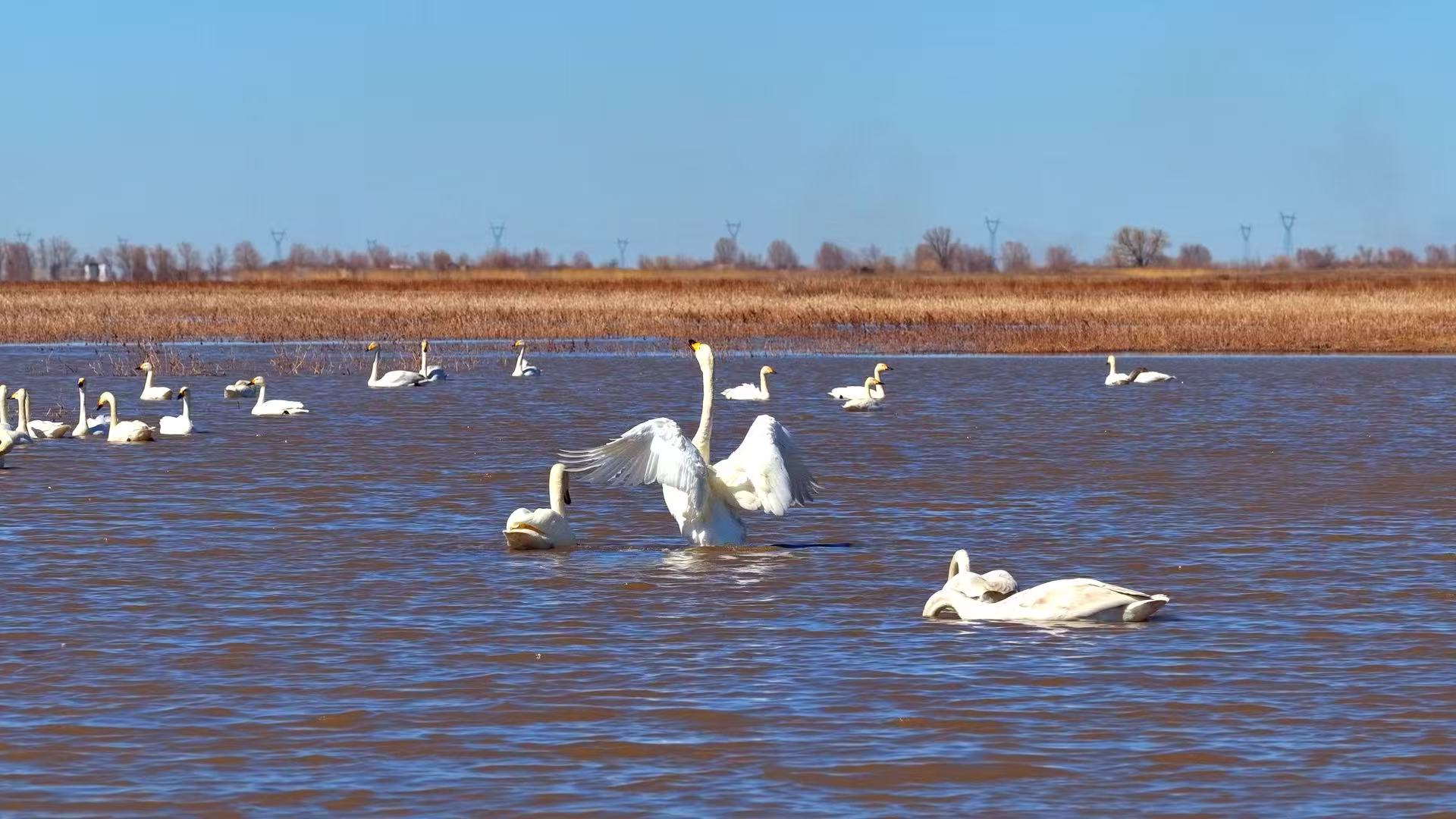 成群大天鹅在湿地水域悠然嬉戏。