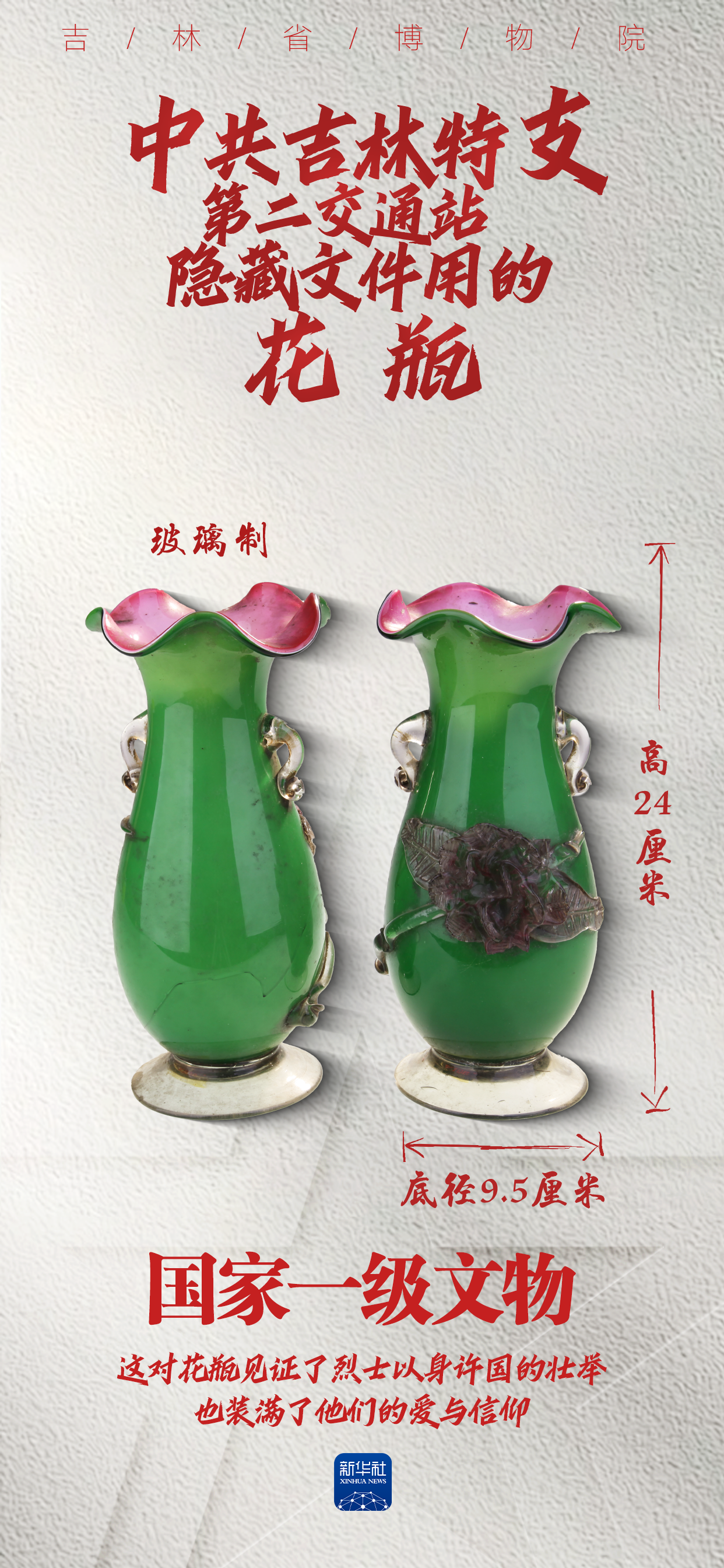 1934年冬,年仅24岁的邓晓村为掩护同志突围而牺牲。没有等到丈夫归来的闫庆莲,想尽办法将花瓶保存了下来。这对花瓶见证了烈士以身许国的壮举,也装满了他们的爱与信仰。