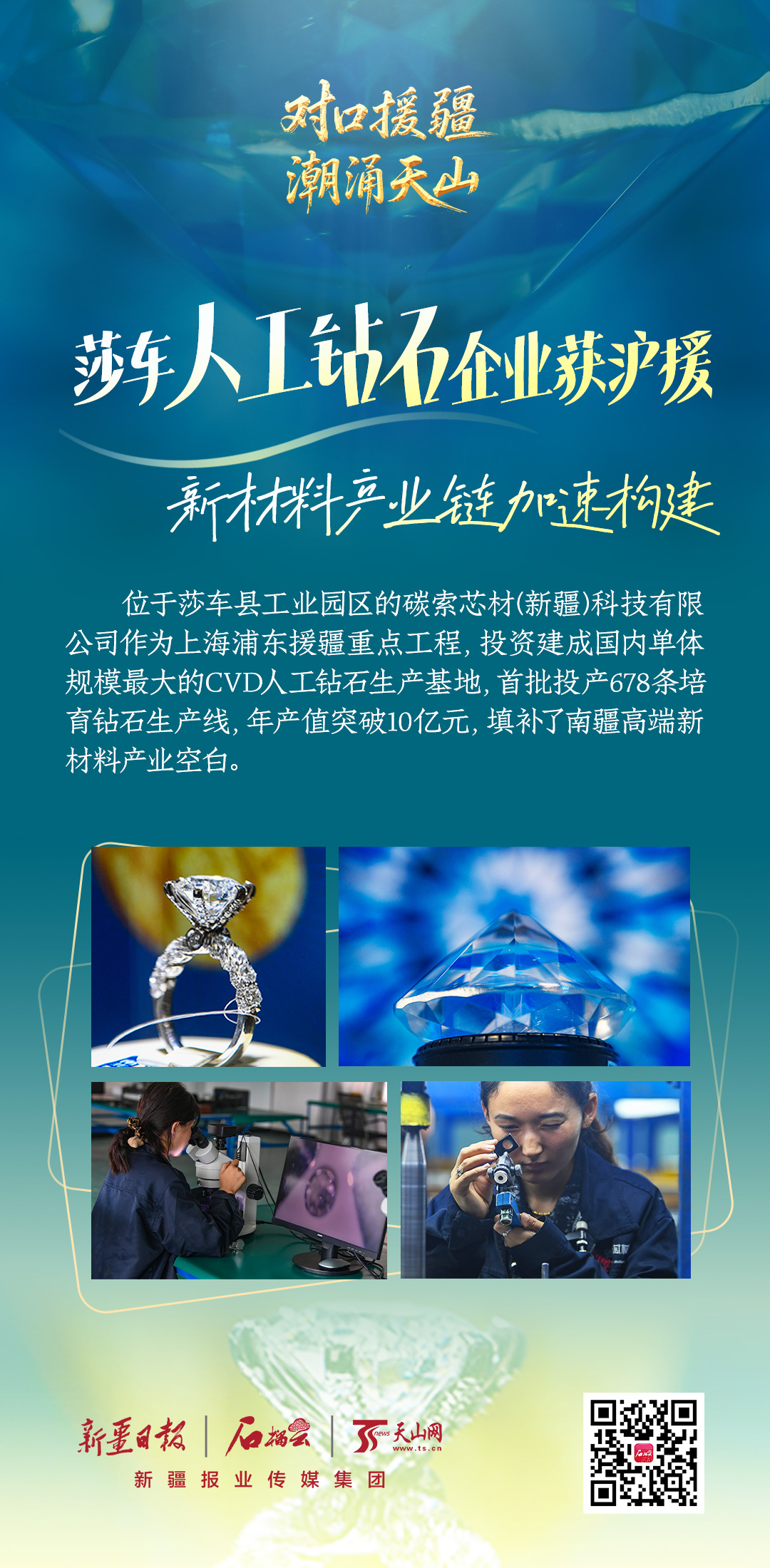 位于莎车县工业园区的碳索芯材(新疆)科技有限公司作为上海浦东援疆重点工程,投资建成国内单体规模最大的CVD人工钻石生产基地,首批投产678条培育钻石生产线,年产值突破10亿元,填补了南疆高端新材料产业空白。