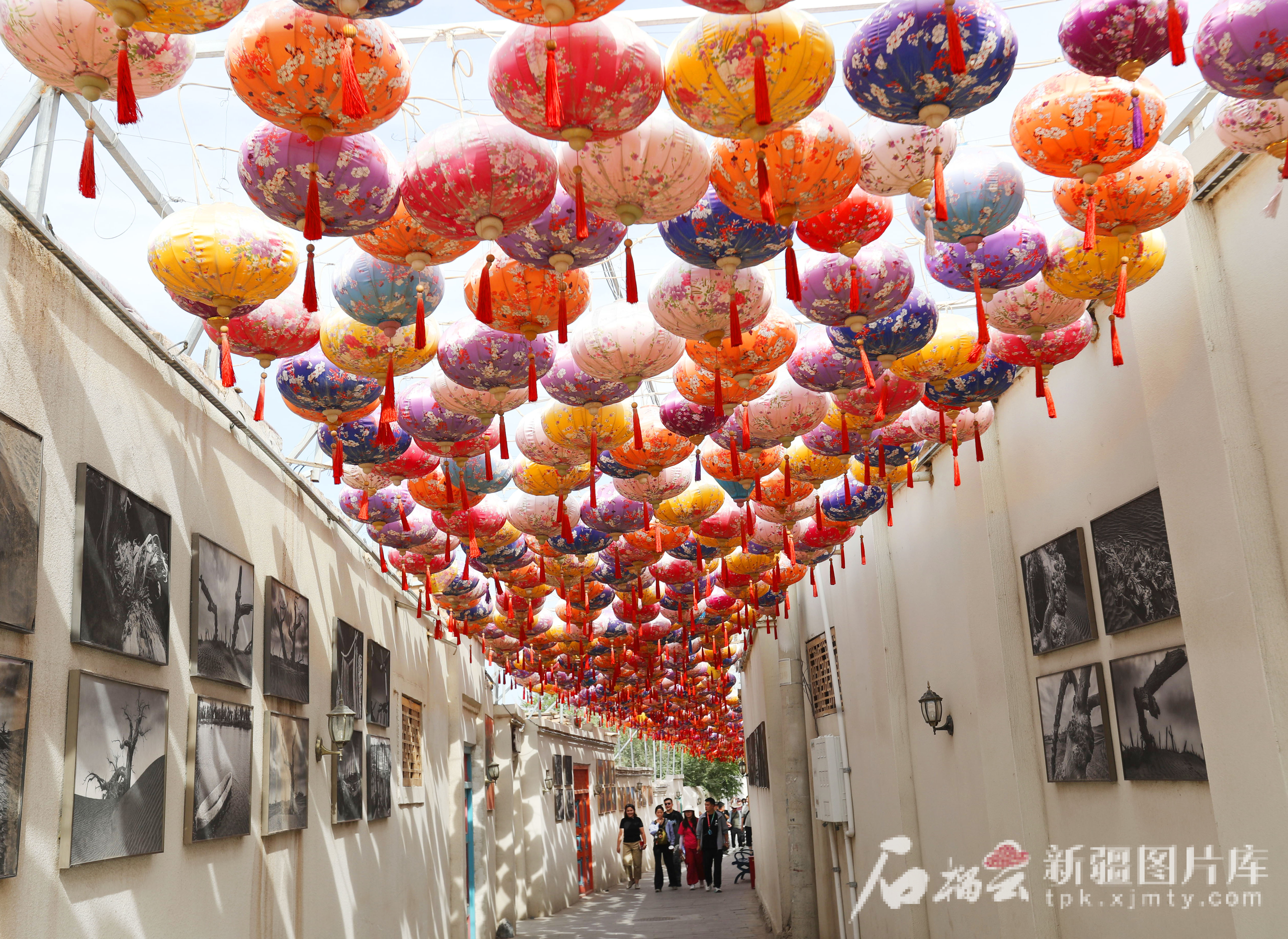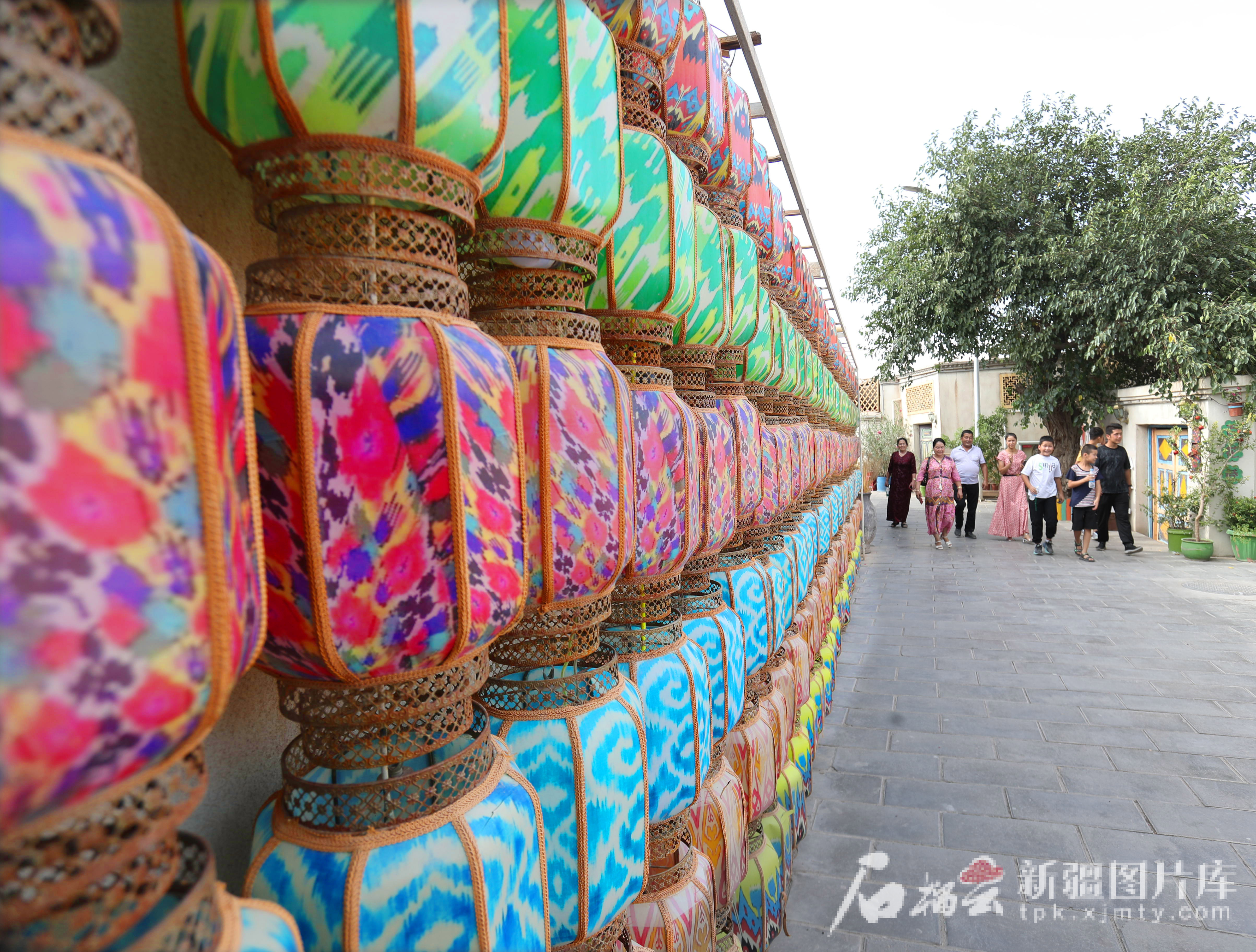 8月13日,游客在龟兹小巷参观艾德莱斯灯笼墙。