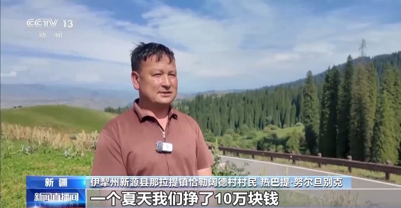 伊犁州新源县那拉提镇恰勒阔德村村民 热巴提·努尔旦别克:现在路修得特别好,游客也多了。一个夏天我们挣了10万块钱,特别开心。