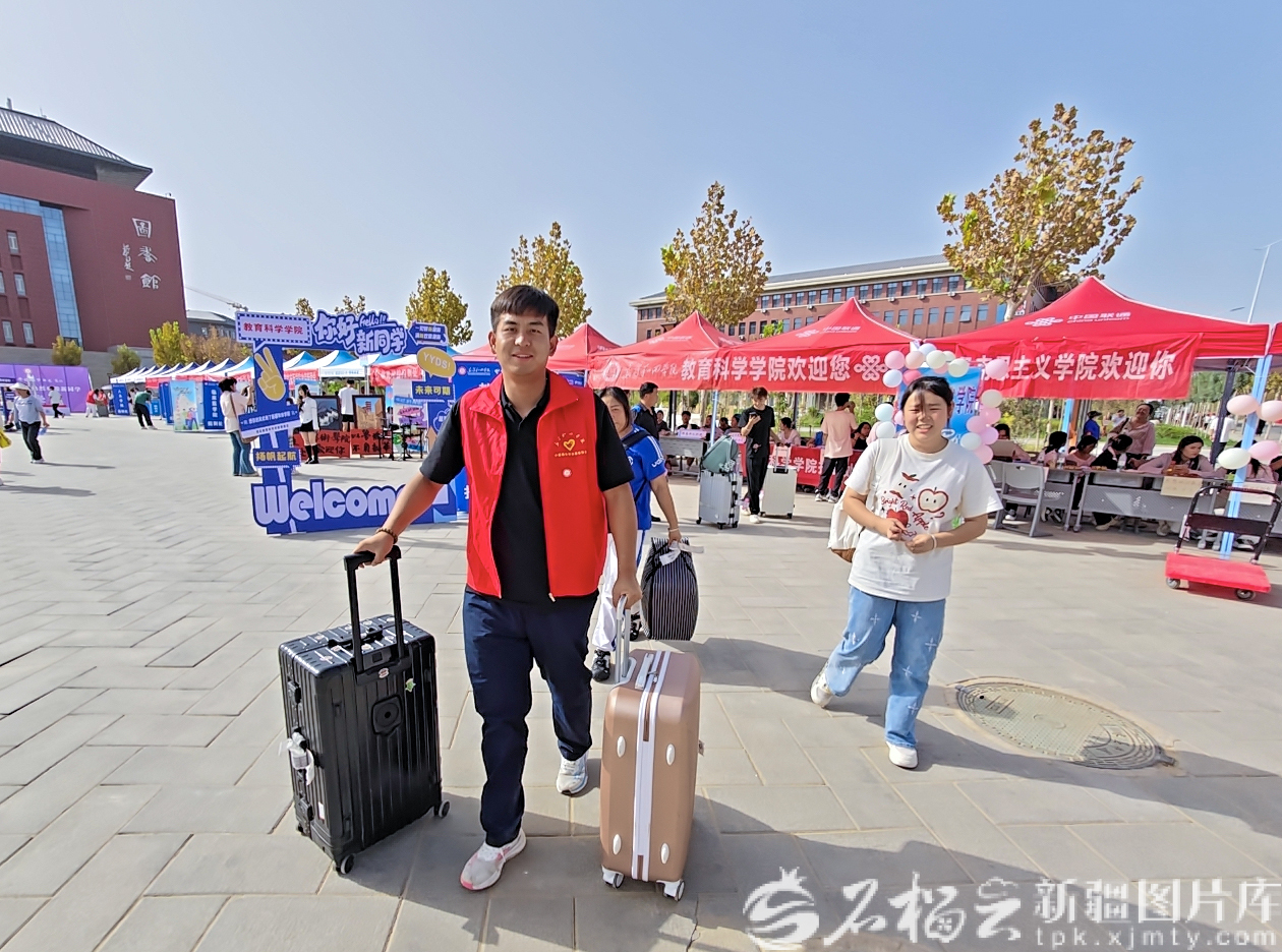 9月12日,志愿者在新疆和田学院帮大一新生拿行李。