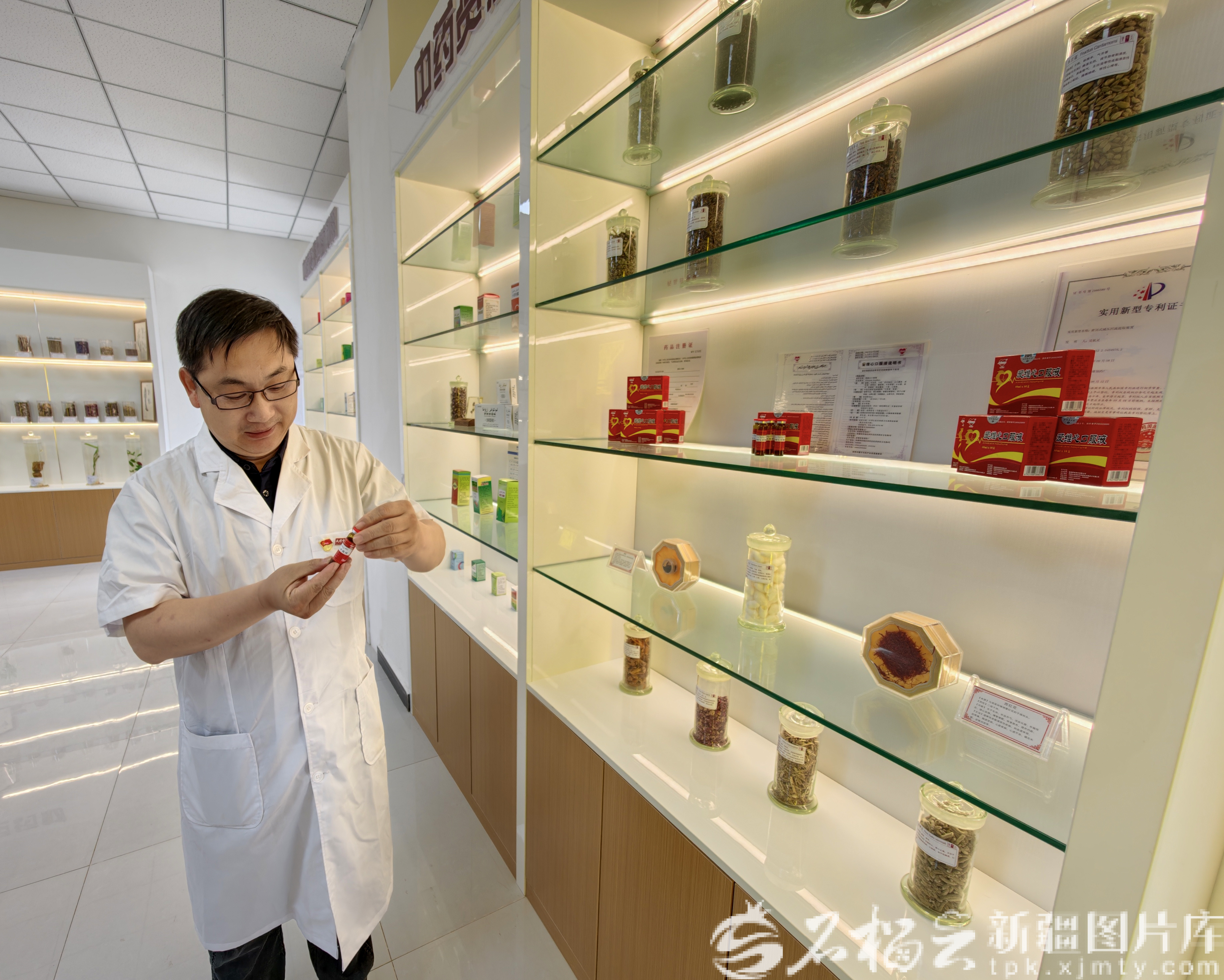 9月12日,一名新疆和田学院药学院教师在介绍该院研发的新药品。