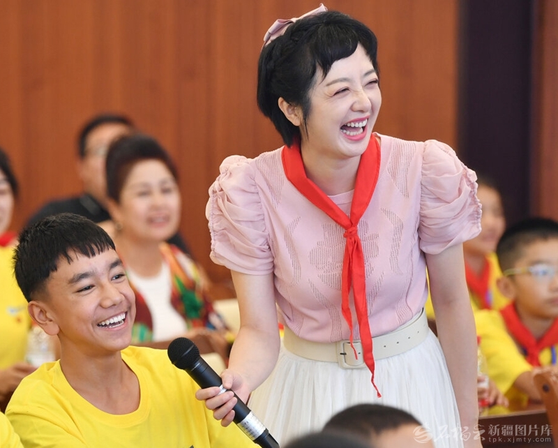 中央广播电视总台主持人杜悦在“石榴籽计划”——我们与海的约定主题研学营开营仪式上采访来自麦盖提县的学生代表(2023年8月4日摄)。天山网-新疆日报记者邹懿摄