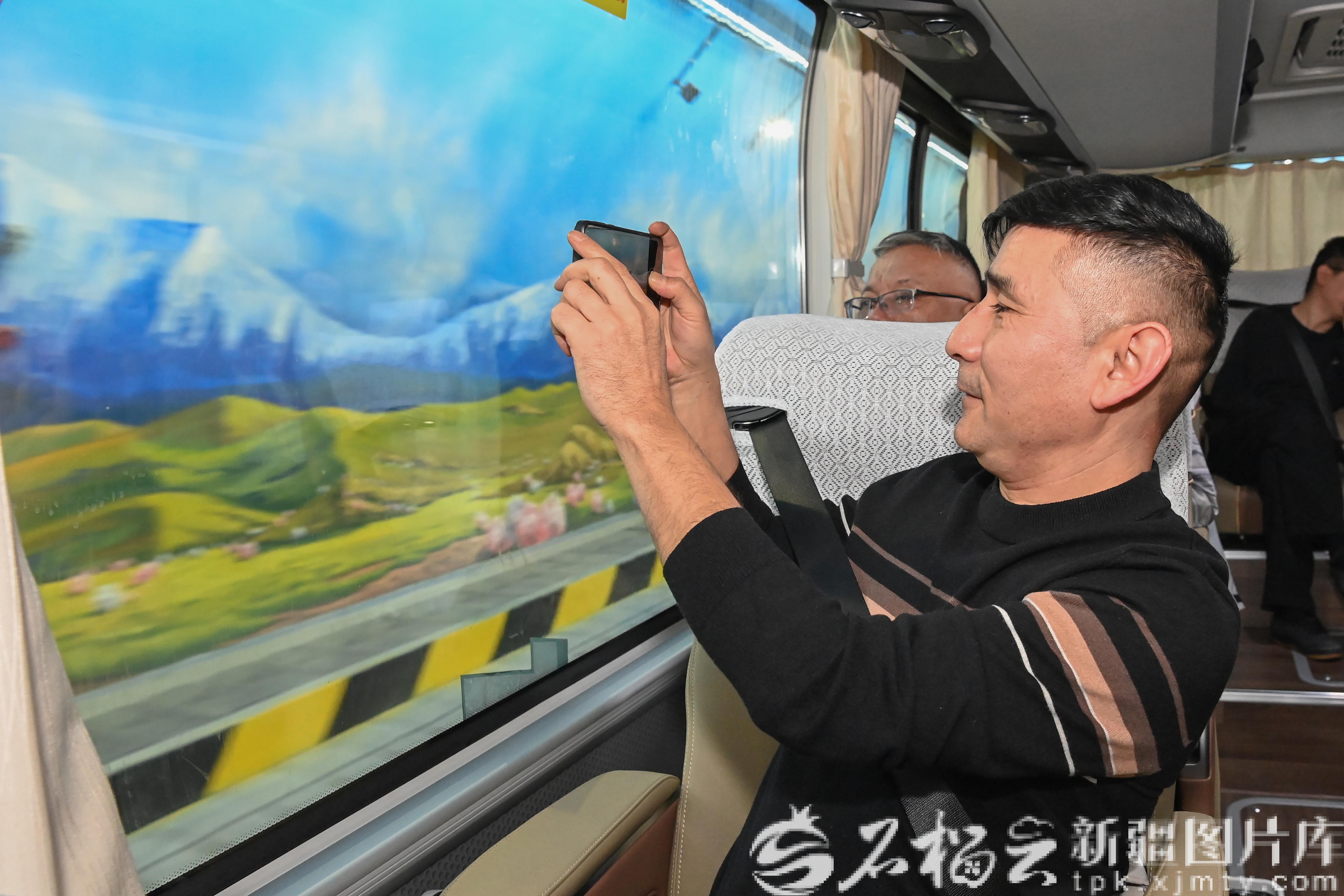1月25日,来自巴音郭楞蒙古自治州的自治区人大代表在车上拍摄乌尉高速公路沿途景色。