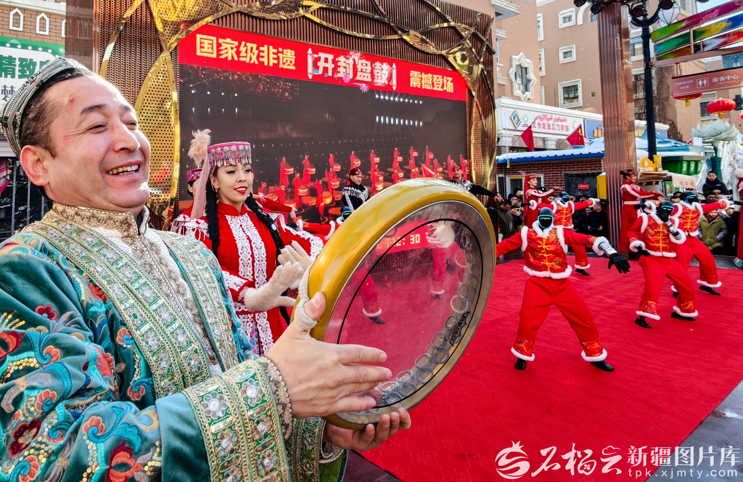 2月17日,新疆国际大巴扎景区,乐手现场伴奏,机器人翩翩起舞。市民和游客欢聚于此,在热闹喜庆的氛围中共度新春佳节。天山网-新疆日报记者 周鹏摄
