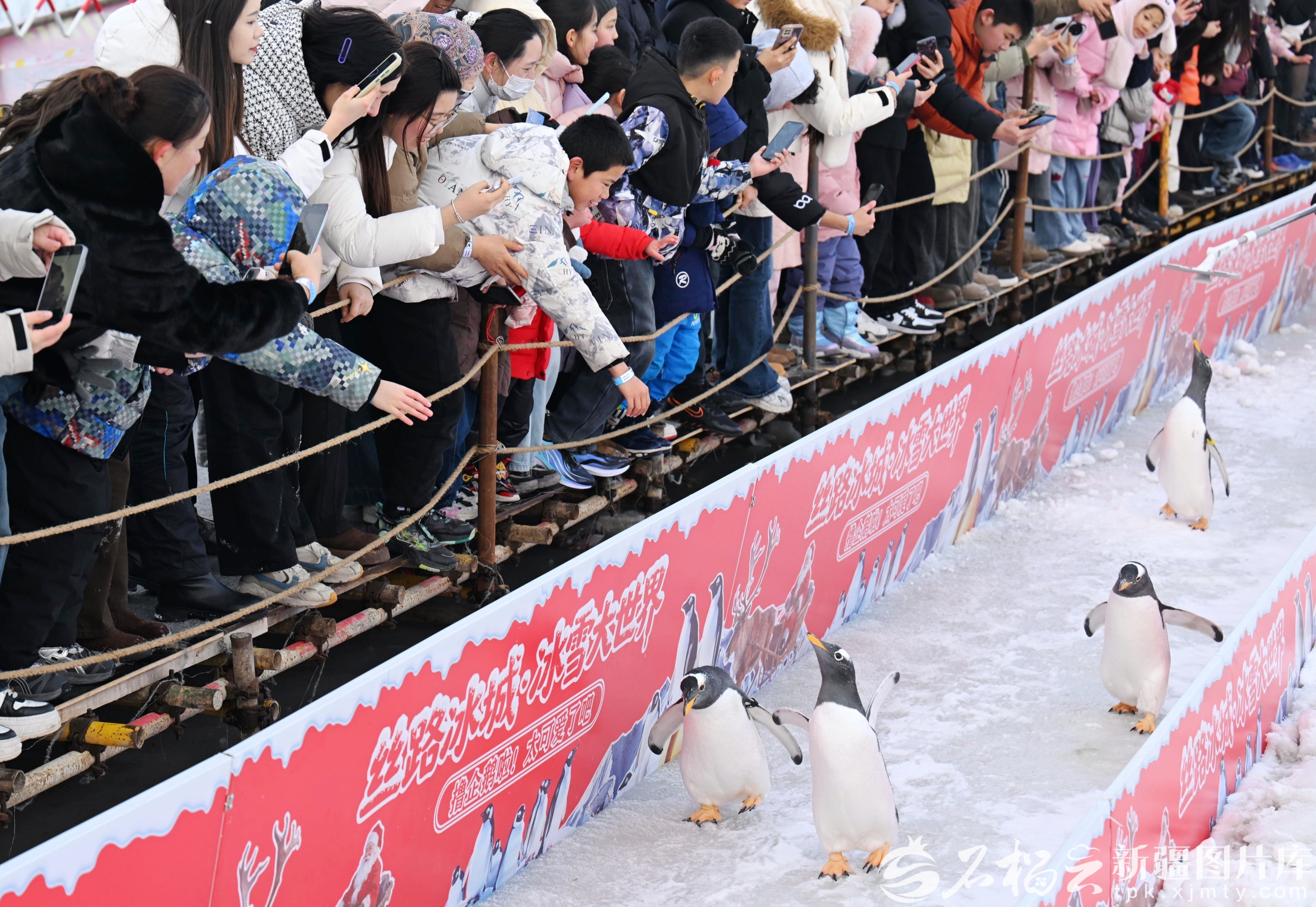 2月19日,市民在昌吉市庭州生态绿谷冰雪乐园观赏企鹅,尽享假日休闲时光。何龙摄