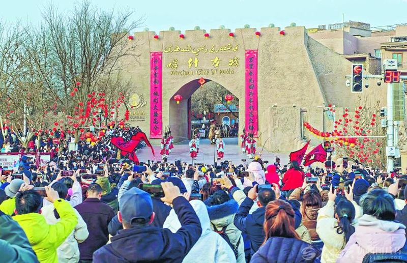 2月22日,游客在喀什古城景区观看舞蹈表演。春节假期,这里游人如织,游客逛古城、品年味,欢度新春佳节。 阿地力江·阿不都卡德尔摄