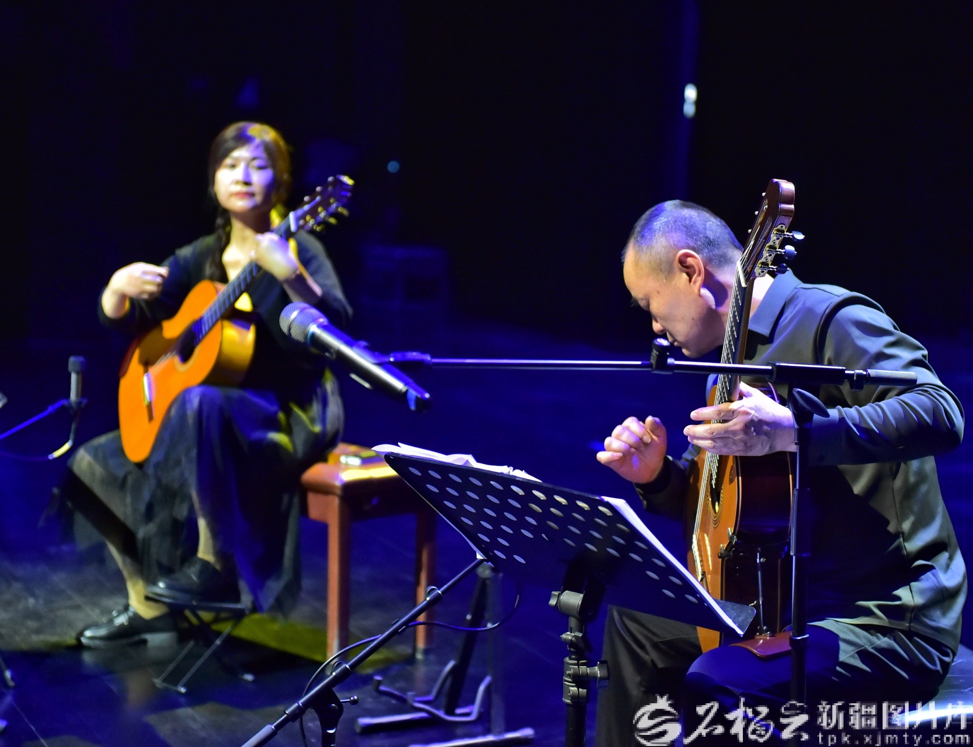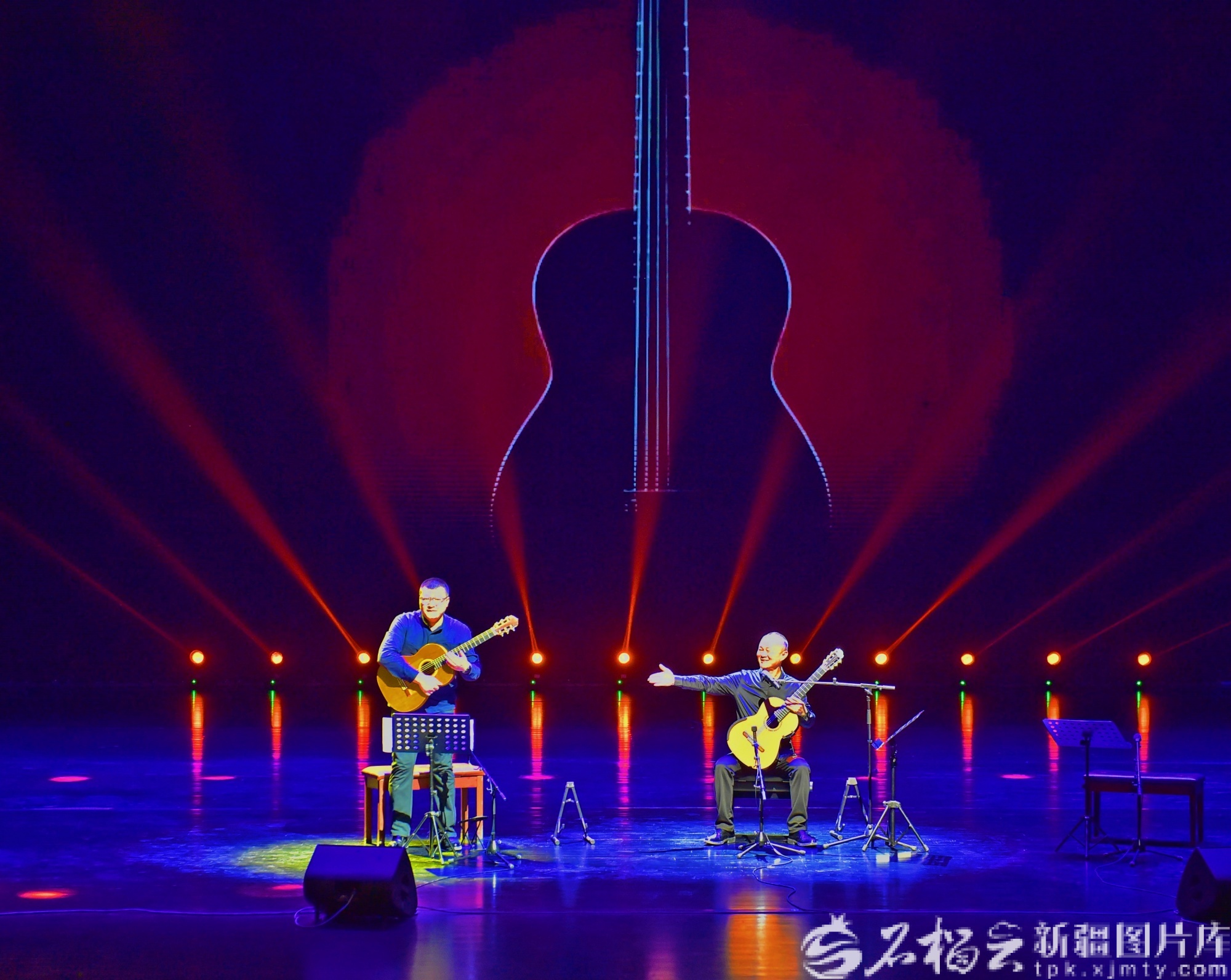 2月23日,巴音郭楞蒙古自治州首届“天山之春”音乐节吉他演奏专场,演员现场表演吉他合奏。