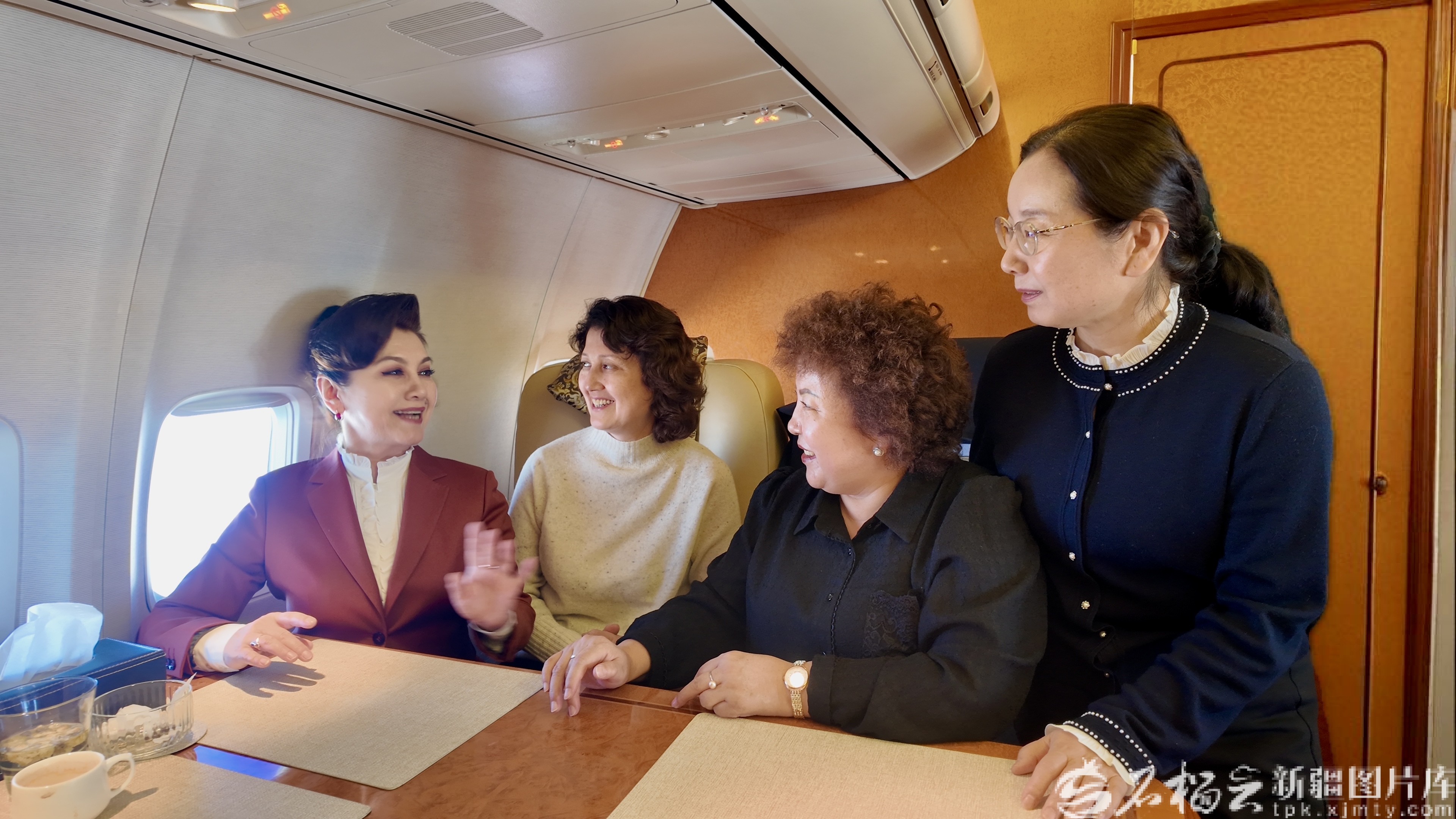 3月3日,出席全国政协十四届四次会议的住疆全国政协委员抵京。图为迪丽娜尔·阿布拉(左一)、木合拜尔·阿布都尔(左二)、阿衣木沙·托合塔洪(右二)、关芳芳委员在前往北京的航班上交流。石榴云/新疆日报记者 王昕摄